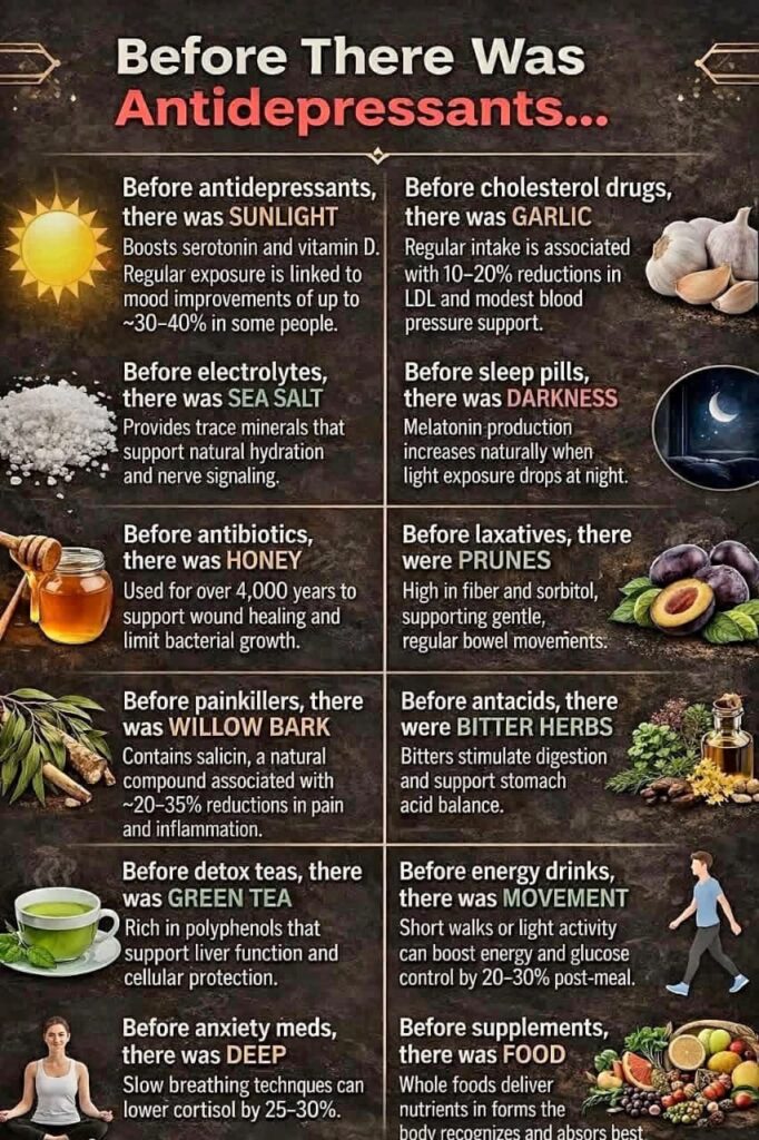 Modern medicine has transformed lives, saved millions, and remains essential for treating serious illness. Yet long before pharmaceuticals existed, humans relied on nature, daily habits, and whole foods to support health and resilience. The image highlights timeless practices that formed the foundation of human wellness—many of which are now supported by modern science. This article […]