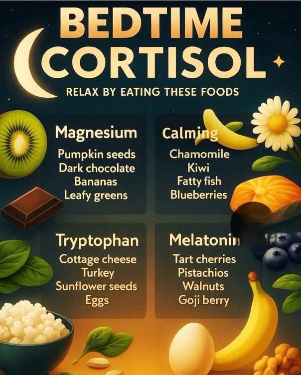 🌙 Bedtime Cortisol: Relax by Eating These Foods Cortisol should naturally drop at night to allow melatonin (the sleep hormone) to rise. When cortisol stays high, it can cause: Trouble falling asleep Night waking Anxiety at bedtime The foods in the image support relaxation through minerals, amino acids, and natural melatonin. 🟢 Magnesium-Rich Foods Why […]
