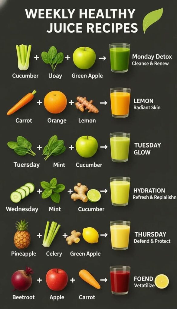 🥬 Weekly Healthy Juice Recipes (Explained) 🟢 Monday – Detox / Cleanse & Renew Ingredients: Cucumber Spinach (the image text looks like “Uoay,” but it’s spinach) Green apple Benefits: Hydration & gentle detox Supports liver function Rich in chlorophyll and antioxidants ✅ Best time: Morning on an empty stomach 🍊 Radiant Skin Juice Ingredients: Carrot […]