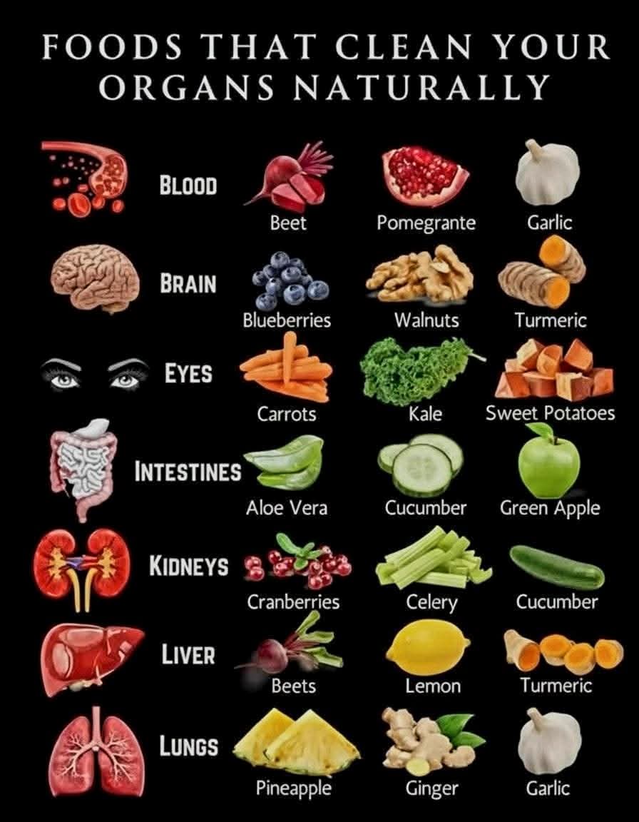 While no food can “clean” your organs the way the graphic suggests, certain foods support these organs, strengthen their function, and reduce inflammation, making it easier for your body to cleanse itself.