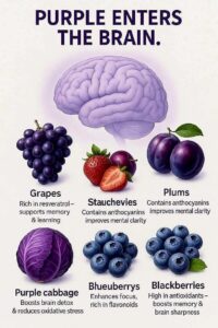 The idea that “purple enters the brain” comes from the science behind anthocyanins—powerful pigments that give many fruits and vegetables their deep purple or blue color. These compounds have been shown to cross the blood–brain barrier, helping protect brain cells, improve circulation, and support cognitive performance.